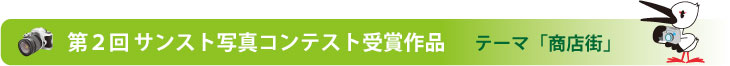 12月に開催したサンスト写真コンテスト『商店街』の審査が、ご来場者のお客様による投票と専門家によって行われ、入賞作品が決定しました。商店街で開催されたお祭りでのシーンや通りを行き交う人々など、商店街の持つ魅力を改めて感じさせてくれるコンテストとなりました。 |